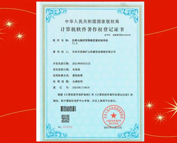 榮獲裝藥器生產(chǎn)控制平臺著作權(quán)登記證書